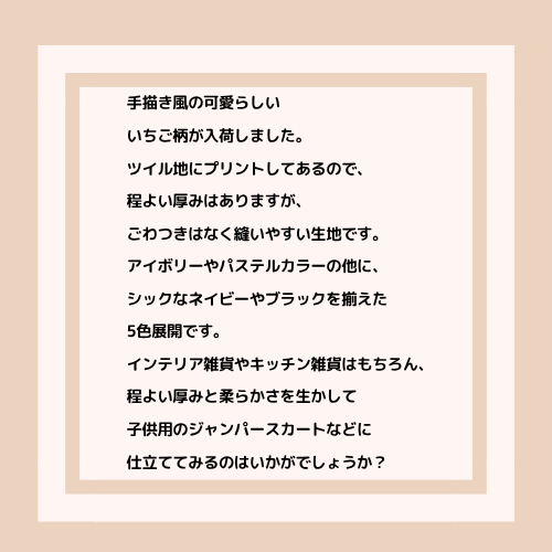 インテリア雑貨やキッチン雑貨はもちろん、 程よい厚みと柔らかさを生かして 子供用のジャンパースカートなどに 仕立ててみるのはいかがでしょうか